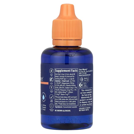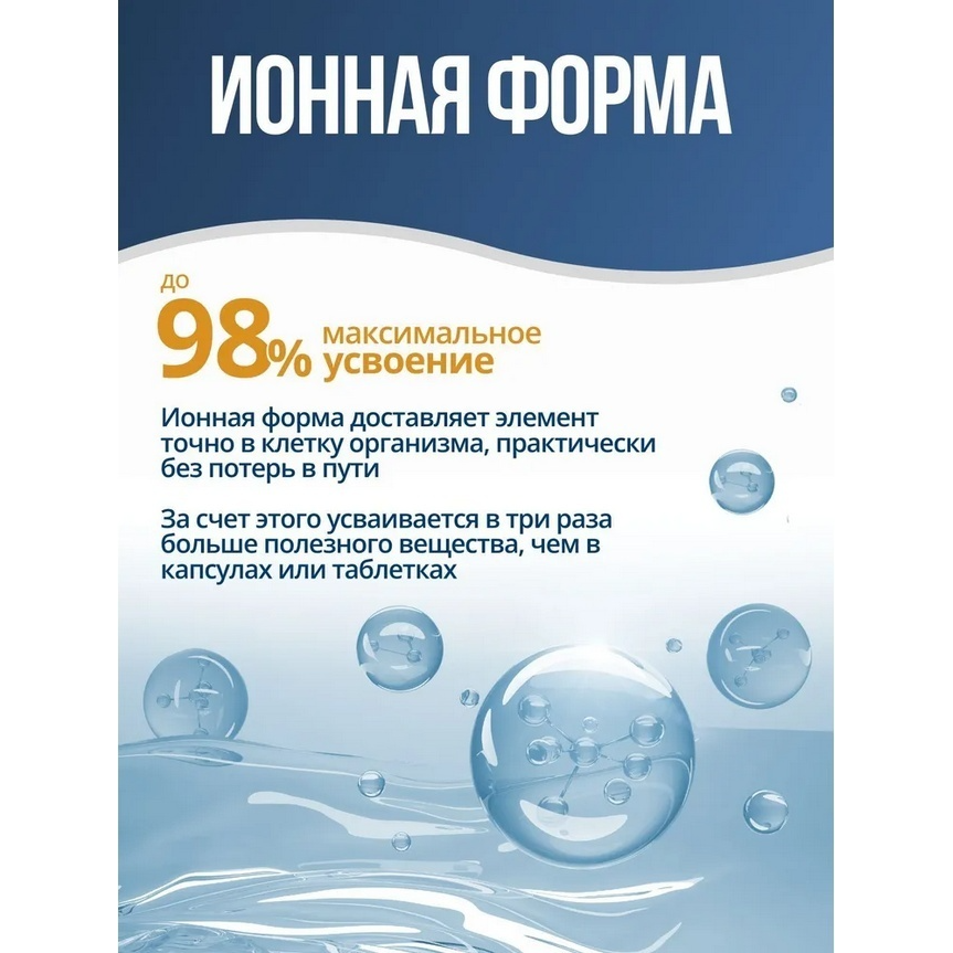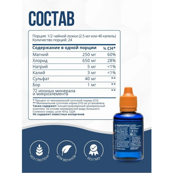 Этот продукт содержит более 72 естественных ионных микроэлементов в различных количествах следов, обнаруженных в морской воде, включая перечисленные выше, а также следующие: кальций, кремний, селен, фосфор, йод, хром, марганец, железо, медь, молибден, цинка, ванадия.