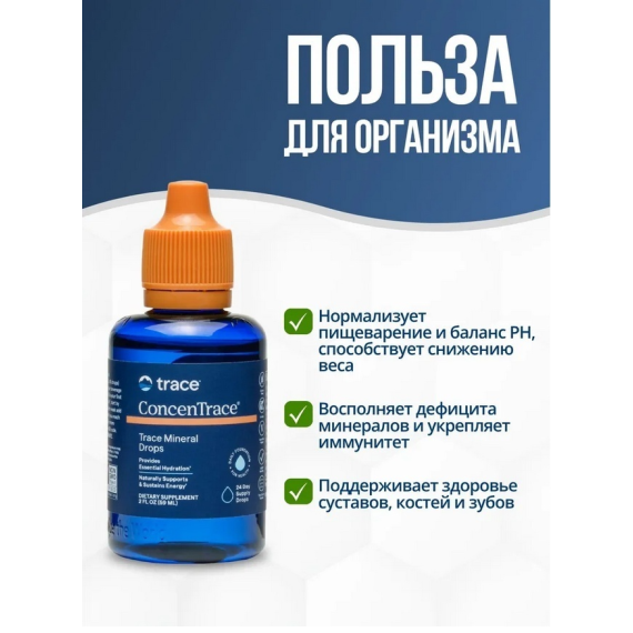 Реминерализация воды: улучшите вкус дистиллированной воды, воды полученной путем обратного осмоса или очищенной воды. Добавление по 20-40 капель на 3,78 л или по вкусу (2-4 капли на стакан) позволяет получить вкус дорогой минеральной воды. Может произойти незначительная кристаллизация, но это не влияет на качество продукта.